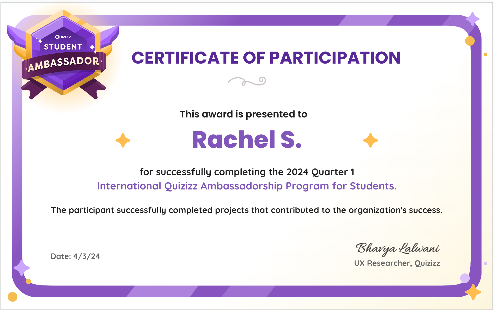 Upon successful completion of the program, students will receive a certificate/letter of commendation and recognition from Quizizz. If requested, students who showed exceptional work ethic or talent may also get a letter of recommendation directly from a Quizizz liaison.
